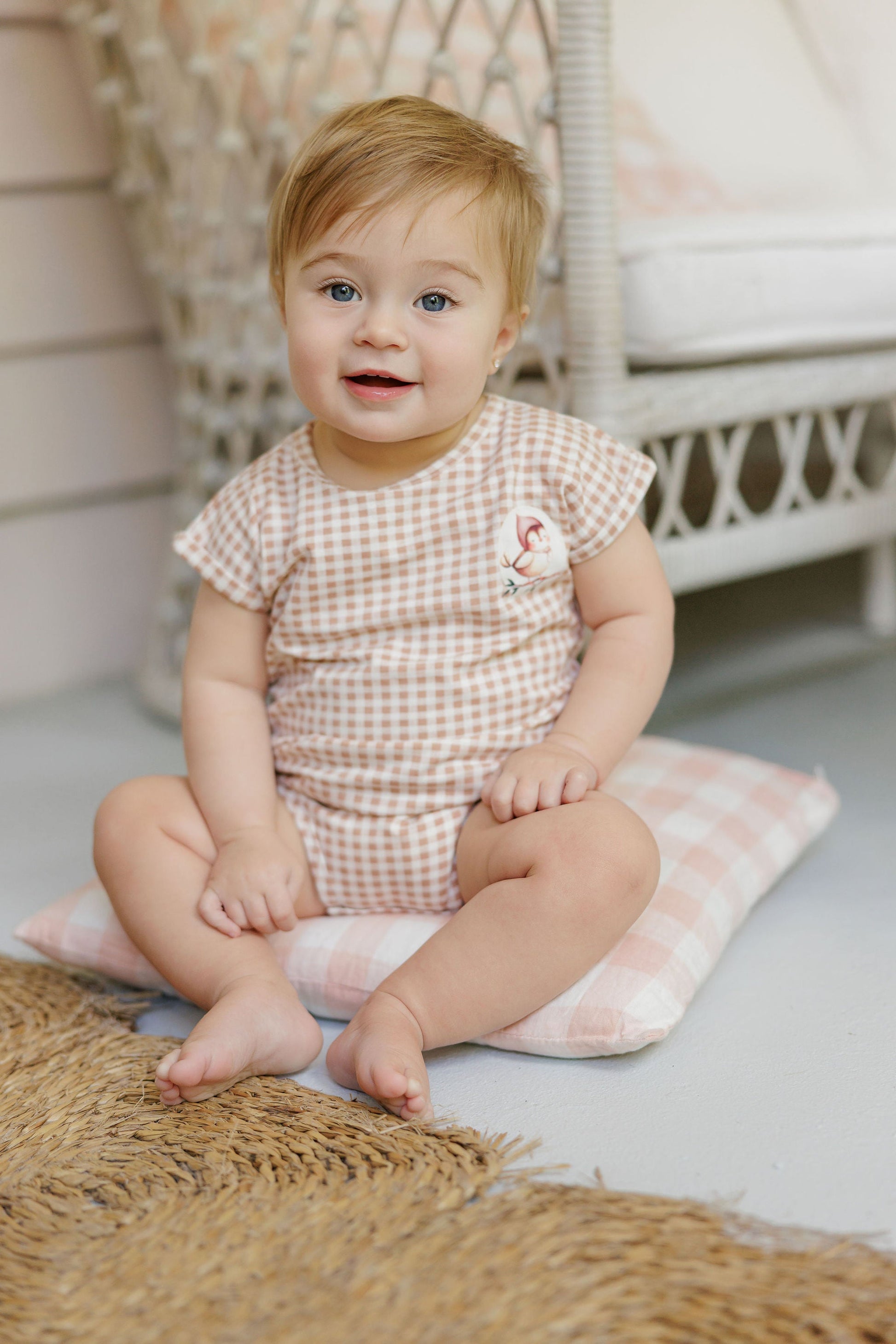 A little gingham, a little woodland charm. The Gingham Owl Collection features classic checks accented with a sweet owl patch for a look that feels both charming and effortlessly refined. Blush and sage hues make these pieces easy to mix, match, and love.