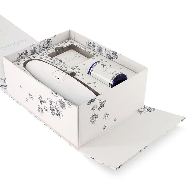 This beautiful gift box includes the Scentfinity Junior home plug-in diffuser and Thyme For Tea luxury fragrance oil. Wrapped in a ready to gift, charming cottage core inspired gift box. Features: Beautiful scenting up to 450 square feet Smooth, elegant coverage Program your custom scenting experience via bluetooth with the Scentfinity App Smart Mode Option: Machine only runs when there is enough light. 12-hour mode: Machine runs every 12 hours. 4 scent intensity settings Clean scenting with cold air diffusion Clean Scenting No smoke. No heat. No water. No residue. Immersive scenting safe for pets, children, paint and furniture.